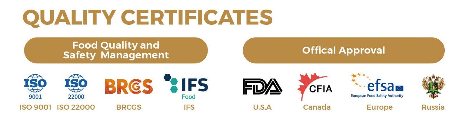 Ranova facilities have been certified by various food security authorities worldwide, including CFIA in Canada, FDA in USA and EFSA in Europe. Its production also complies with ISO, BRCGS and IFS food requirements.